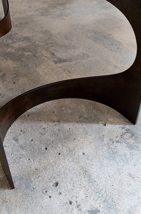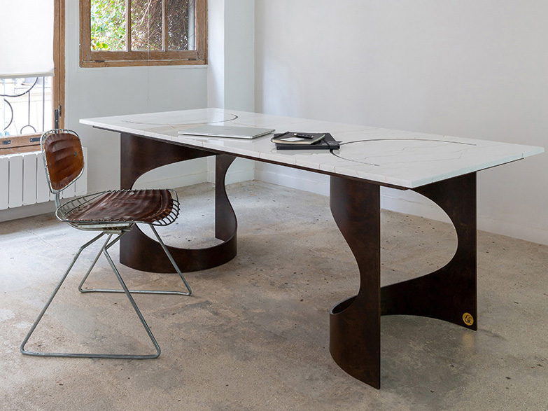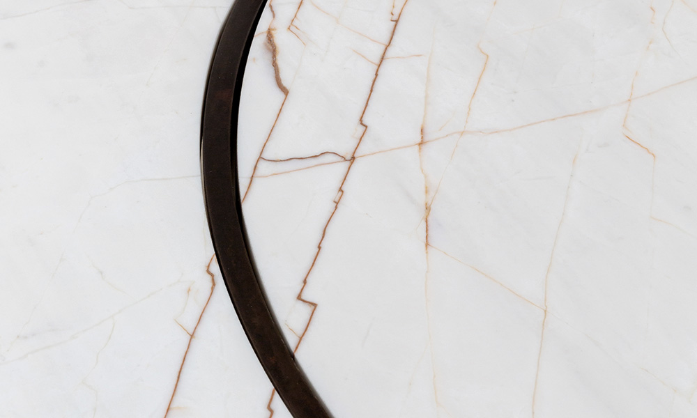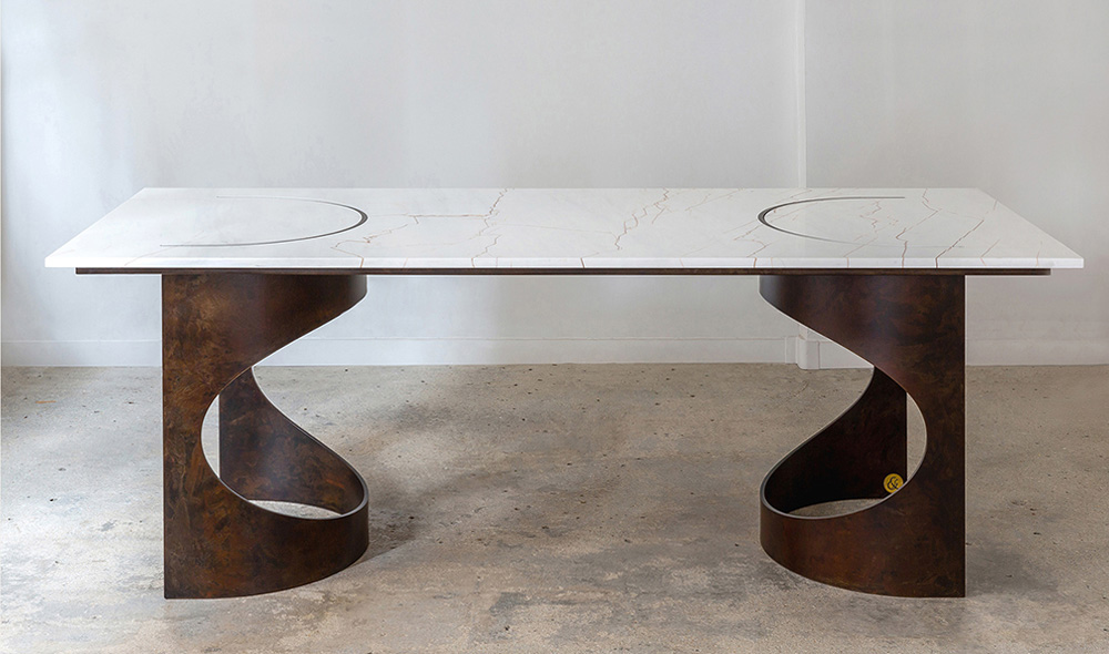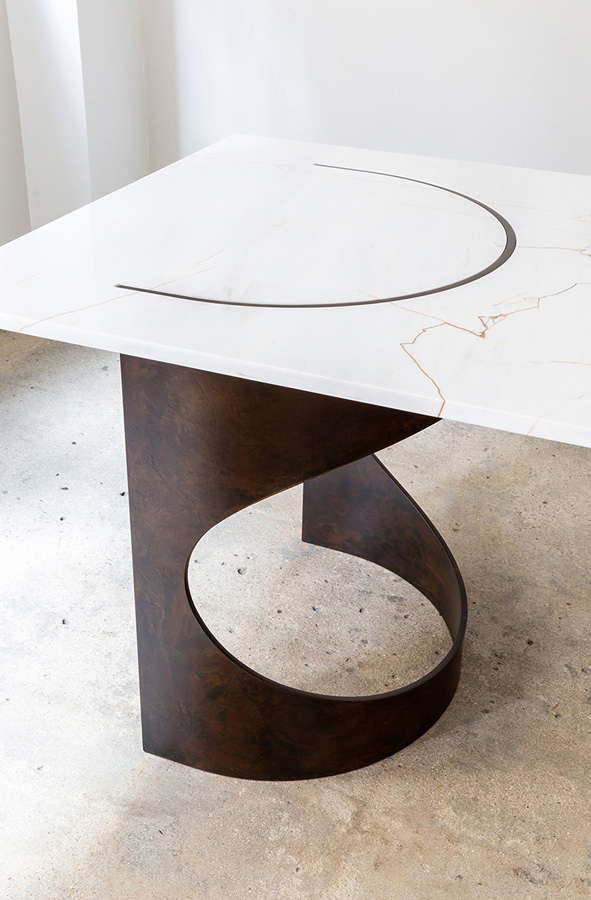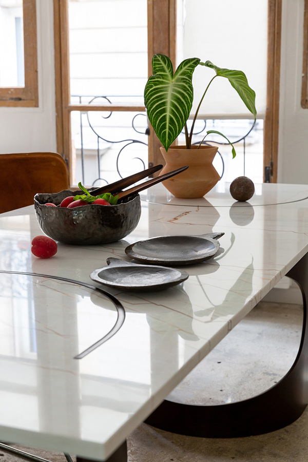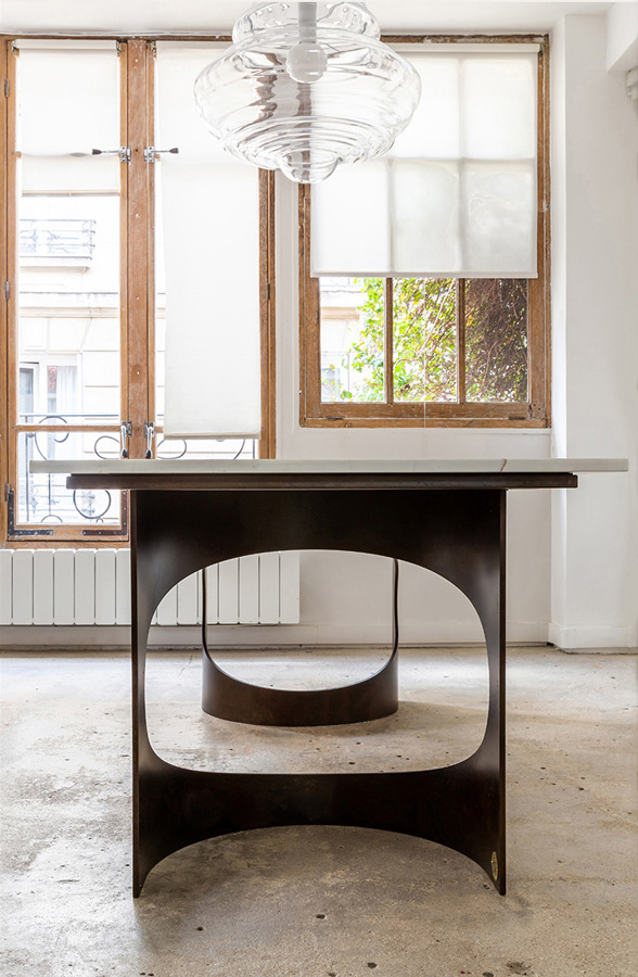 La table BACO se singularise par un piètement traversant le plateau, s’y encastrant avec précision et se révélant en affleurement à la surface de la pierre.